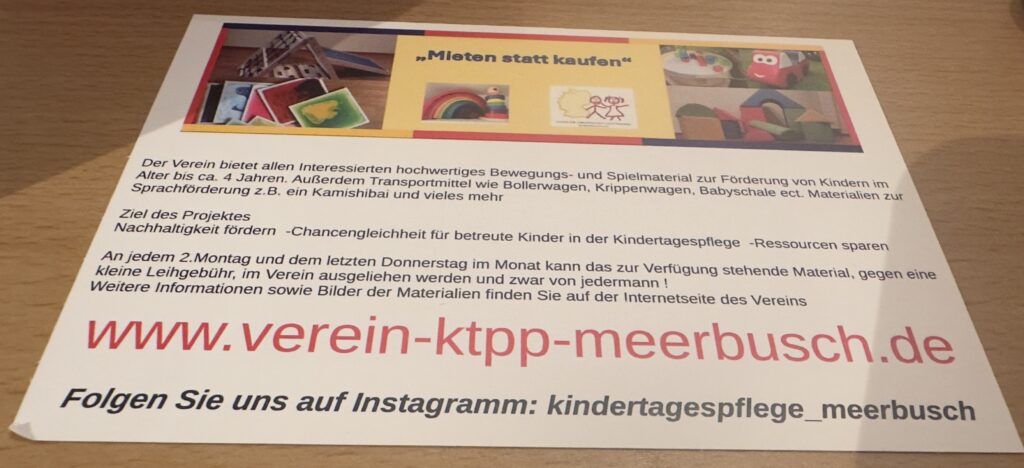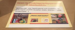 Der Verein möchte Hilfsmittel, Geräte und hochwertige SpielMaterialien anschaffen, die bei Bedarf und Interesse gegen eine geringe Mietgebühr für einen vereinbarten Zeitraum von den Kindertagespflegepersonen und Familien ausgeliehen werden können. Es lohnt sich ökologisch und finanziell diese Gegenstände bei Bedarf zu mieten ohne diese dauerhaft selber anschaffen zu müssen.